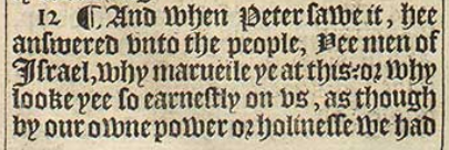 12 ¶ And when Peter sawe it, hee answered vnto the people, Yee men of Israel, why marueile ye at this? or why looke yee so earnestly on vs, as though by our owne power or holinesse we had made this man to walke?