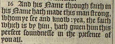 16 And his Name through faith in his Name hath made this man strong, whom ye see and know: yea, the faith which is by him, hath giuen him this perfect soundnesse in the presence of you all.