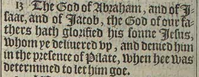 13 The God of Abraham, and of Isaac, and of Iacob, the God of our fathers hath glorified his sonne Iesus, whom ye deliuered vp, and denied him in the presence of Pilate, when hee was determined to let him goe.