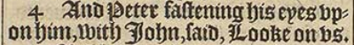 4 And Peter fastening his eyes vpon him, with Iohn, said, Looke on vs.