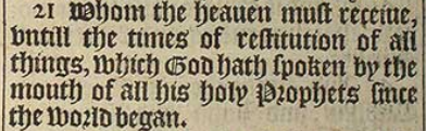 21 Whom the heauen must receiue, vntill the times of restitution of all things, which God hath spoken by the mouth of all his holy Prophets since the world began.