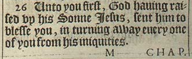 26 Unto you first, God hauing raised vp his Sonne Iesus, sent him to blesse you, in turning away euery one of you from his iniquities.