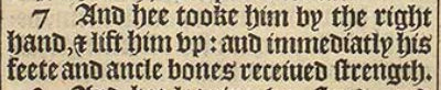 7 And hee tooke him by the right hand, & lift him vp: and immediatly his feete and ancle bones receiued strength.