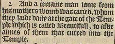 2 And a certaine man lame from his mothers womb was caried, whom they laide daily at the gate of the Temple which is called Beautifull, to aske almes of them that entred into the Temple.