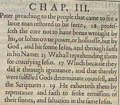 Peter preaching to the people that came to see a lame man restored to his feete, 12 professeth the cure not to haue beene wrought by his, or Iohns owne power, or holinesse, but by God, and his sonne Iesus, and through faith in his Name: 13 Withall reprehending them for crucifying Iesus. 17 Which because they did it through ignorance, and that thereby were fulfilled Gods determinate counsell, and the Scriptures: 19 He exhorteth them by repentance and faith to seeke remission of their sinnes, and saluation in the same Iesus.