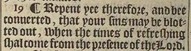 19 ¶ Repent yee therefore, and bee conuerted, that your sins may be blotted out, when the times of refreshing shal come from the presence of the Lord.