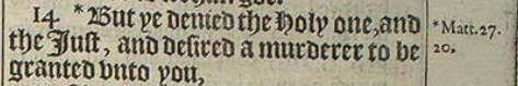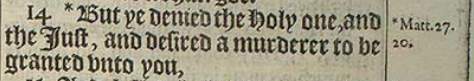 14 *But ye denied the Holy one, and the Iust, and desired a murderer to be granted vnto you,[*Matt.27.20.]