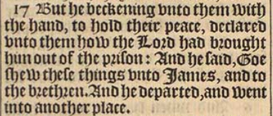 17 But he beckening vnto them with the hand, to hold their peace, declared vnto them how the Lord had brought him out of the prison: And he said, Goe shew these things vnto Iames, and to the brethren. And he departed, and went into another place.
