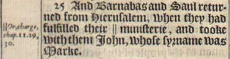 25 And Barnabas and Saul returned from Hierusalem, when they had fulfilled their || ministerie, and tooke with them Iohn, whose syrname was Marke.[|| Or, charge, chap.11.29, 30.]