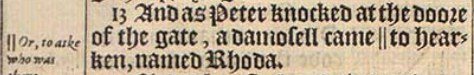 13 And as Peter knocked at the doore of the gate, a damosell came || to hearken, named Rhoda.[|| Or, to aske who was there.]