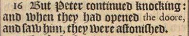 16 But Peter continued knocking: and when they had opened the doore, and saw him, they were astonished.