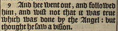 9 And hee went out, and followed him, and wist not that it was true which was done by the Angel: but thought he saw a vision.