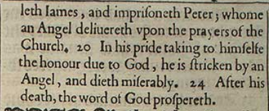 23 And immediatly the Angel of the Lord smote him, because hee gaue not God the glory, and hee was eaten of wormes, and gaue vp the ghost.