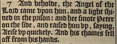 7 And beholde, the Angel of the Lord came vpon him, and a light shined in the prison: and hee smote Peter on the side, and raised him vp, saying, Arise vp quickely. And his chaines fell off from his hands.