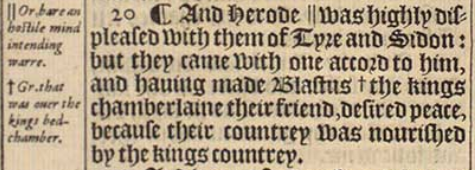 20 ¶ And Herode || was highly displeased with them of Tyre and Sidon: but they came with one accord to him, and hauing made Blastus +the kings chamberlaine their friend, desired peace, because their countrey was nourished by the kings countrey. [ ||Or, bare an hostile mind intending warre. , +Gr. that was ouer the kings bed-chamber. ]