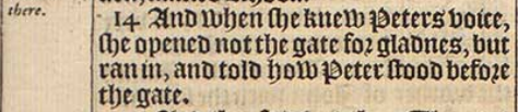 14 And when she knew Peters voice, she opened not the gate for gladnes, but ran in, and told how Peter stood before the gate.