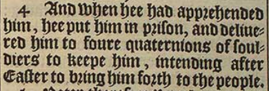 4 And when hee had apprehended him, hee put him in prison, and deliuered him to foure quaternions of souldiers to keepe him, intending after Easter to bring him forth to the people.
