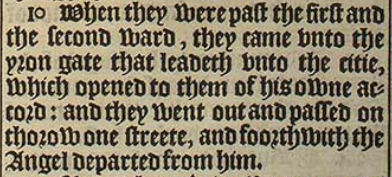 10 When they were past the first and the second ward, they came vnto the yron gate that leadeth vnto the citie, which opened to them of his owne accord: and they went out and passed on thorow one streete, and foorthwith the Angel departed from him.