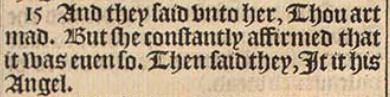 15 And they said vnto her, Thou art mad. But she constantly affirmed that it was euen so. Then said they, It it his Angel.