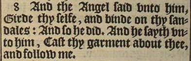 8 And the Angel said vnto him, Girde thy selfe, and binde on thy sandales: And so he did. And he sayth vnto him, Cast thy garment about thee, and follow me.