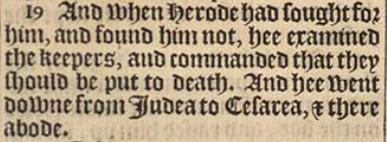 19 And when Herode had sought for him, and found him not, hee examined the keepers, and commanded that they should be put to death. And hee went downe from Iudea to Cesarea, & there abode.