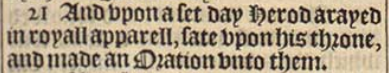 21 And vpon a set day Herod arayed in royall apparell, sate vpon his throne, and made an Oration vnto them.