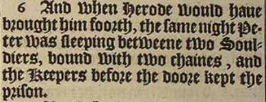 6 And when Herode would haue brought him foorth, the same night Peter was sleeping betweene two Souldiers, bound with two chaines, and the Keepers before the doore kept the prison.