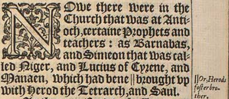 1 Nowe there were in the Church that was at Antioch, certaine Prophets and teachers: as Barnabas, and Simeon that was called Niger, and Lucius of Cyrene, and Manaen, which had bene || brought vp with Herod the Tetrarch, and Saul.[||Or, Herods foster brother.]