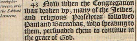 43 Now when the Congregation was broken vp, many of the Iewes, and religious Proselytes followed Paul and Barnabas, who speaking to them, perswaded them to continue in the grace of God.