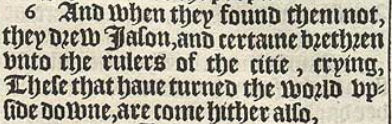 6 And when they found them not, they drew Iason, and certaine brethren vnto the rulers of the citie, crying, These that haue turned the world vpside downe, are come hither also,