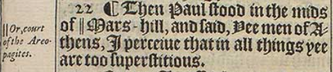 22 ¶ Then Paul stood in the mids of ||Mars-hill, and said, Yee men of Athens, I perceiue that in all things yee are too superstitious. [|| Or, court of the Areopagites.]