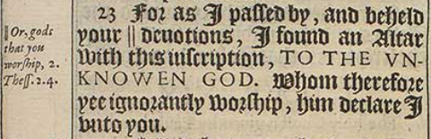 23 For as I passed by, and beheld your || deuotions, I found an Altar with this inscription, TO THE VNKNOWEN GOD. Whom therefore yee ignorantly worship, him declare I vnto you. [|| Or, gods that you worship, 2. Thess. 2. 4.]