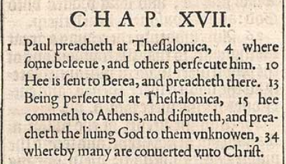 1 Paulus predigt in Thessalonich, 4 wo einige glauben und andere ihn verfolgen. 10 Er wird nach Beröa gesandt und predigt dort. 13 In Thessalonich verfolgt, 15 kommt er nach Athen und streitet und predigt den ihnen unbekannten lebendigen Gott, 34 wodurch viele zu Christus bekehrt werden.