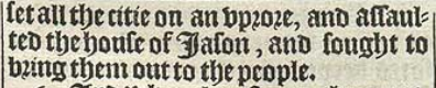 5 ¶ But the Iewes which beleeued not, mooued with enuie, tooke vnto them certaine lewd fellowes of the baser sort, and gathered a company, and set all the citie on an vprore, and assaulted the house of Iason, and sought to bring them out to the people.