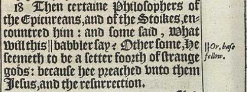 18 Then certaine Philosophers of the Epicureans, and of the Stoikes, encountred him: and some said, What will this || babbler say? Othersome, He seemeth to be a setter foorth of strange gods: because hee preached vnto them Iesus, and the resurrection. [|| Or, base fellow.]