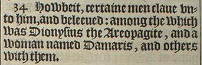 34 Howbeit, certaine men claue vnto him, and beleeued: among the which was Dionysius the Areopagite, and a woman named Damaris, and others with them.