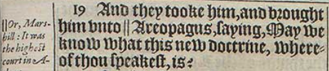 19 And they tooke him, and brought him vnto || Areopagus, saying, May we know what this new doctrine, whereof thou speakest, is? [||Or, Mars-hill: It was the highest court in Athens.]