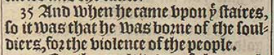 35 And when he came vpon þe staires, so it was that he was borne of the souldiers, for the violence of the people.