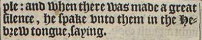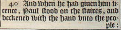 40 And when he had giuen him licence, Paul stood on the staires, and beckened with the hand vnto the people: and when there was made a great silence, he spake vnto them in the Hebrew tongue, saying.