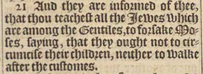 21 And they are informed of thee, that thou teachest all the Iewes which are among the Gentiles, to forsake Moses, saying, that they ought not to circumcise their children, neither to walke after the customes.