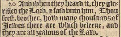 20 And when they heard it, they glorified the Lord, & said vnto him, Thou seest, brother, how many thousands of Iewes there are which beleeue, and they are all zealous of the Law.