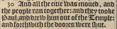 30 And all the citie was moued, and the people ran together: and they tooke Paul, and drew him out of the Temple: and forthwith the doores were shut.