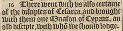 16 There went with vs also certaine of the disciples of Cesarea, and brought with them one Mnason of Cyprus, an old disciple, with whō we should lodge.