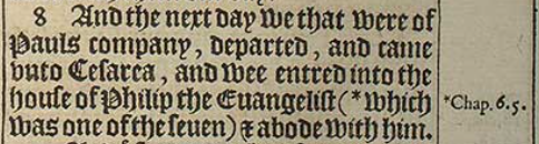8 And the next day we that were of Pauls company, departed, and came vnto Cesarea, and wee entred into the house of Philip the Euangelist (*which was one of the seuen) & abode with him.[*Chap.6.5.]
