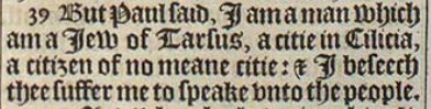 39 But Paul said, I am a man which am a Iew of Tarsus, a citie in Cilicia, a citizen of no meane citie: & I beseech thee suffer me to speake vnto the people.