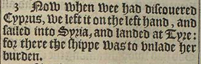 3 Now when wee had discouered Cyprus, we left it on the left hand, and sailed into Syria, and landed at Tyre: for there the shippe was to vnlade her burden.