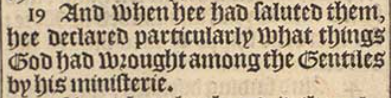 19 And when hee had saluted them, hee declared particularly what things God had wrought among the Gentiles by his ministerie.