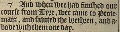 7 And when wee had finished our course from Tyre, wee came to Ptolemais, and saluted the brethren, and abode with them one day.