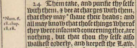 24 Then take, and purifie thy selfe with them, & bee at charges with them, that they may *shaue their heads: and all may know that those things wherof they were informed concerning thee, are nothing, but that thou thy selfe also walkest orderly, and keepest the Law.[*Num.6. 18. chap. 18.18.]