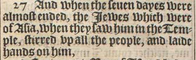 27 And when the seuen dayes were almost ended, the Iewes which were of Asia, when they saw him in the Temple, stirred vp all the people, and laide hands on him,